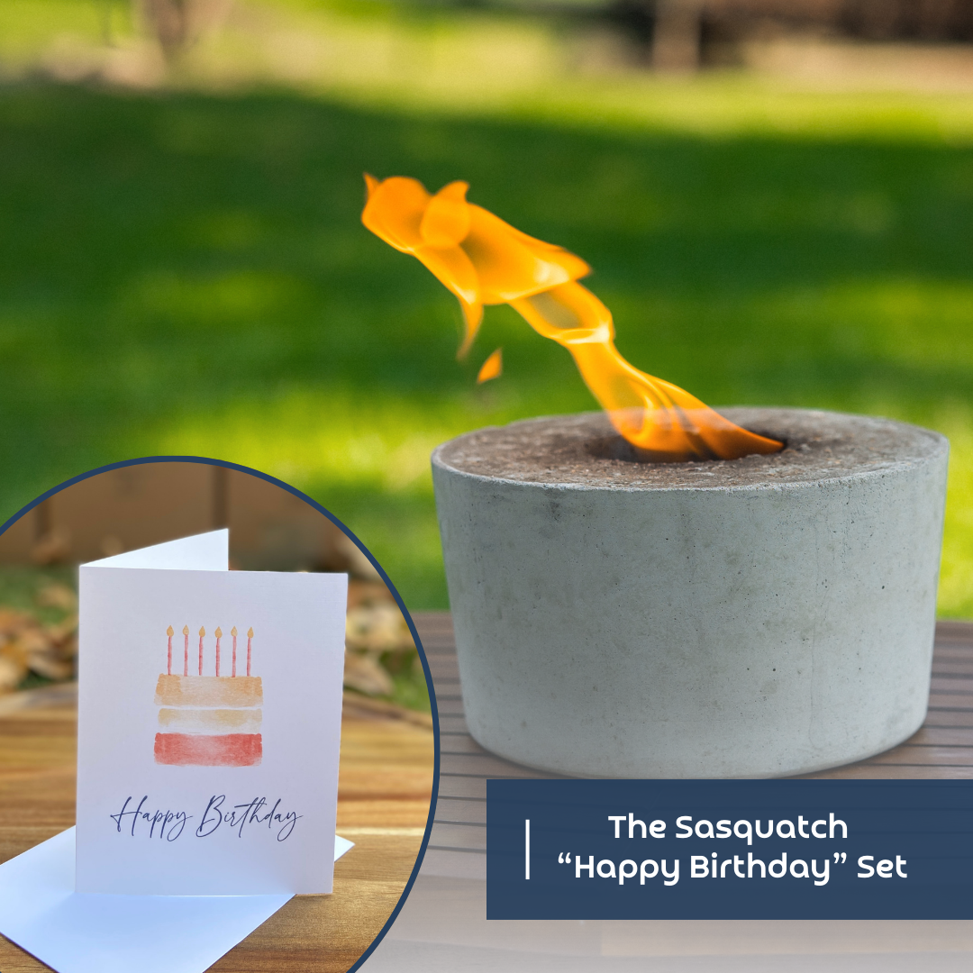 The 'HAPPY BIRTHDAY' Sasquatch SET comes with The Sasquatch fire pot, matching concrete lid, cork trivet and custom greeting card. A personal touch as if it came from you!
