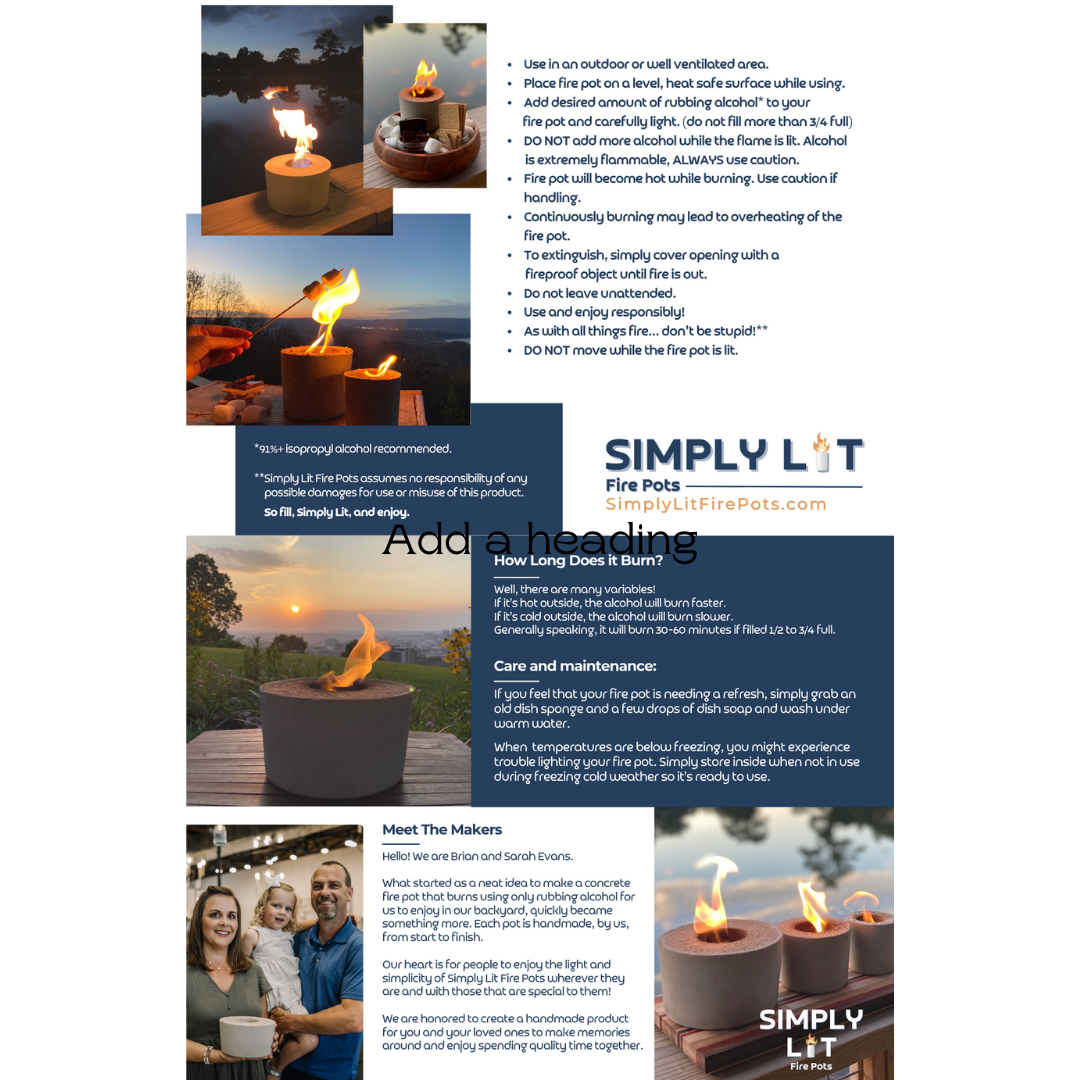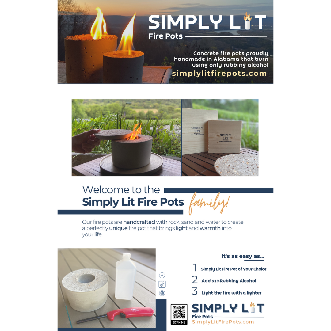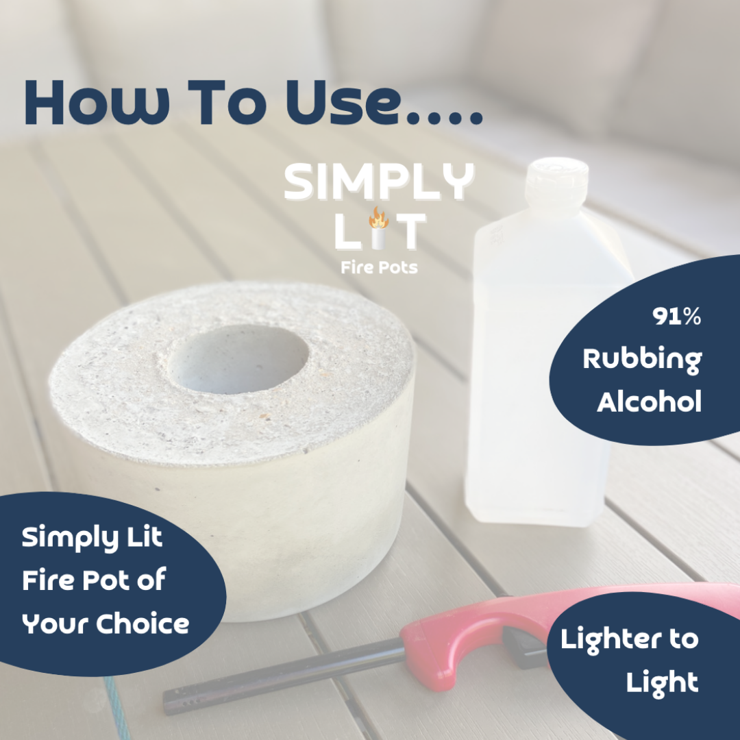 Our company is called "Simply Lit Fire Pots" because the only supplies you need to instantly enjoy a fire is our Simply Lit concrete tabletop fire pot and 91% isopropyl alcohol. Fill the center reservoir with the desired amount of alcohol, light and you are ready to enjoy the warm glow of a fire!